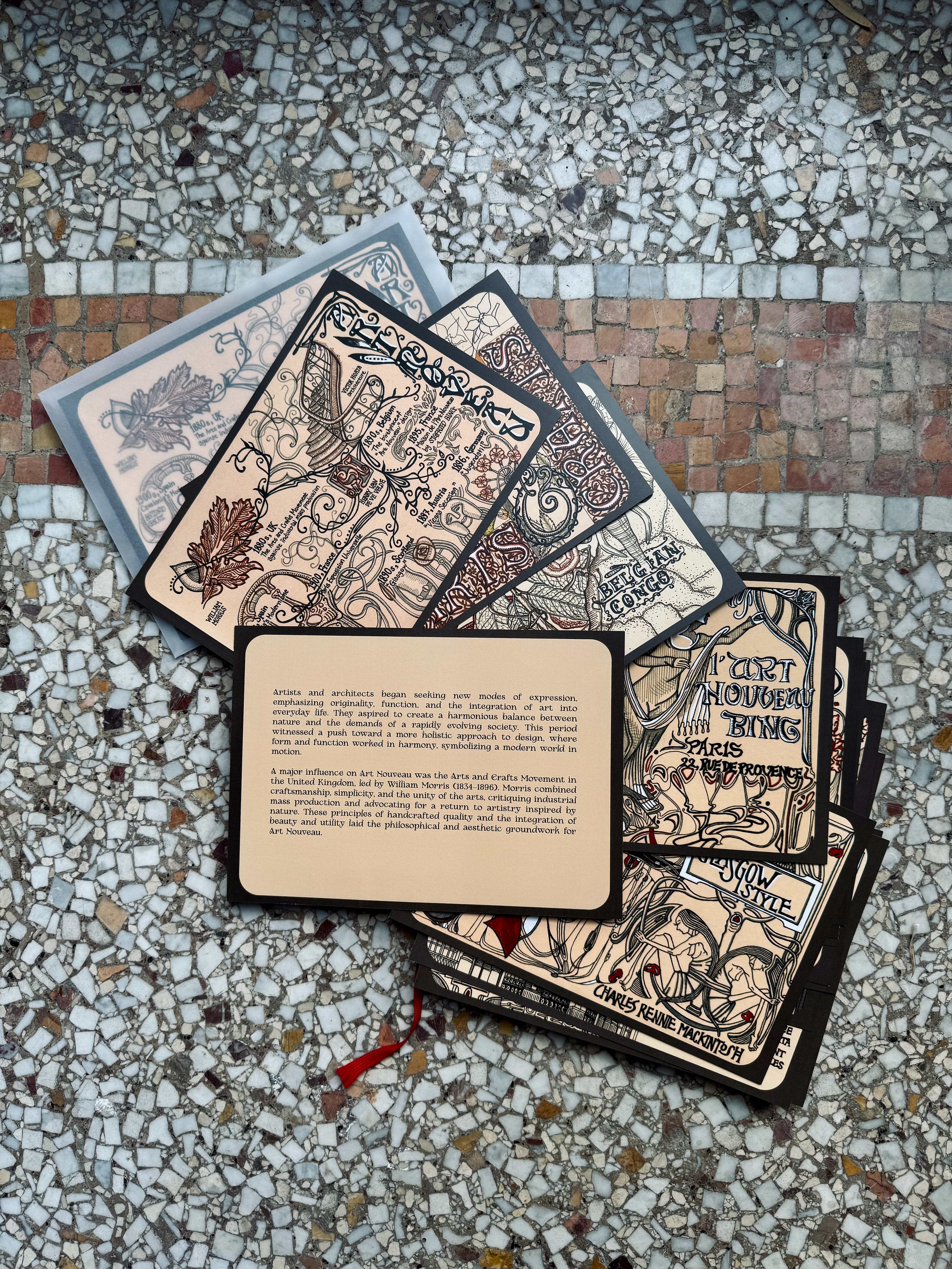 Each postcard is accompanied by a short text highlighting key moments in the development of Art Nouveau. Together, the cards offer an illustrated reflection on the history behind Belgium and the Birth of Art Nouveau: Shaping a Modernist Movement (ISBN 978-3-033-11593-4).